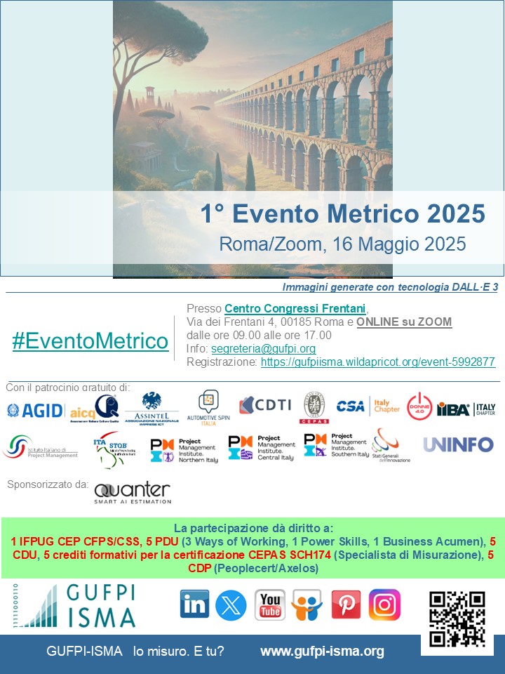 Il 16 maggio dalle 9.00 alle 17.00 si svolgerà Evento Metrico, organizzato dall'associazione GUFPI-ISMA (Gruppo Utenti Function Point Italia – Italian Software Metrics Association) che si occupa di misurazione del […]