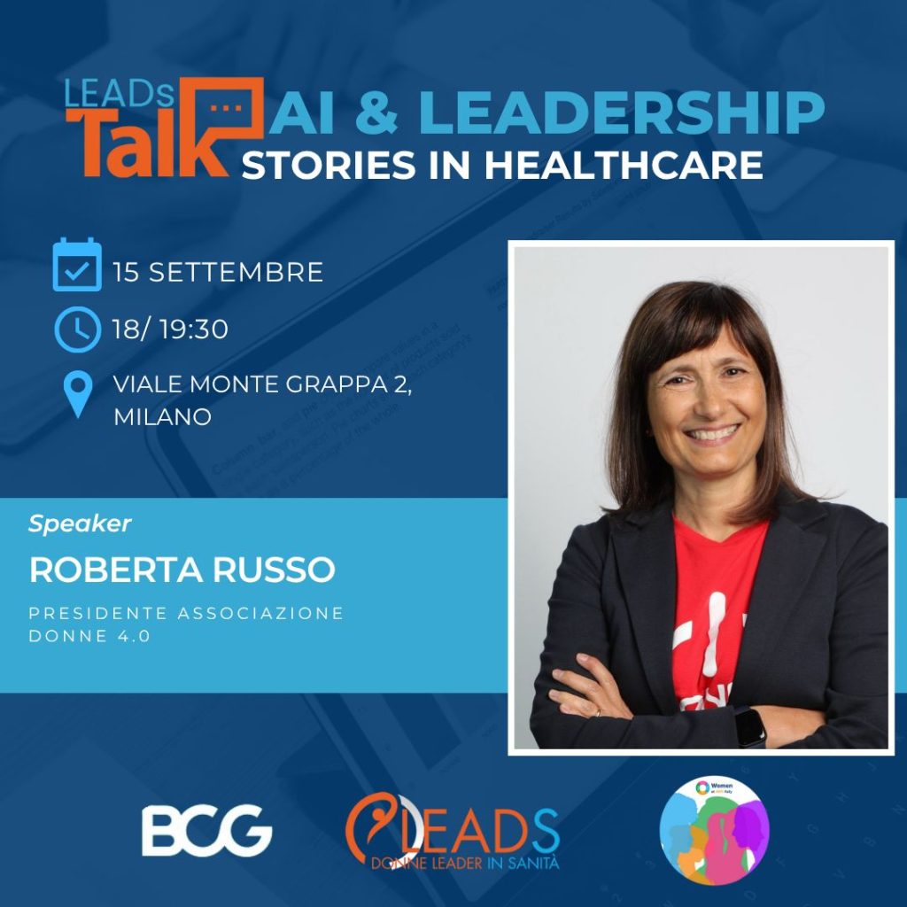 Il prossimo 15 Settembre 2025 alle 18 si svolgerà l’evento AI & Leadership in Sanità organizzato da Leads in collaborazione con women@AWS presso Amazon Italia, in via Montegrappa 2 a Milano, a cui parteciperà come speaker la nostra Presidente Roberta Russo.