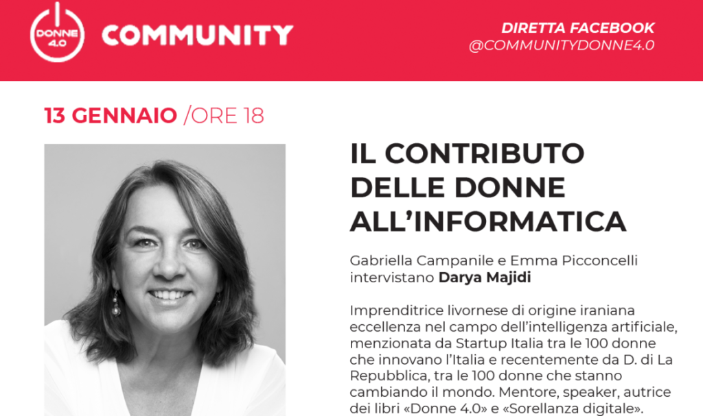 Quarto appuntamento della Rubrica “Donne Protagoniste del futuro” della Community Donne 4.0, Gabriella Campanile e Emma Picconcelli intervistano Darya Majidi.Imprenditrice livornese di origine iraniana eccellenza nel campo dell’intelligenza artificiale, menzionata da Startup Italia tra le 100 donne che innovano l’Italia e recentemente da D. di La Repubblica, tra le 100 donne che stanno cambiando il mondo. Mentore, speaker, autrice dei libri «Donne 4.0» e «Sorellanza digitale».